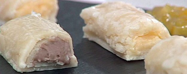 2. Colocamos la masa sobre un papel de horno sobre el que habremos espolvoreado una pizca de harina y la estiramos con el rodillo (embadurnado también con harina) hasta obtener una lámina rectangular muy fina, de un grosor aproximado de 2 milímetros.